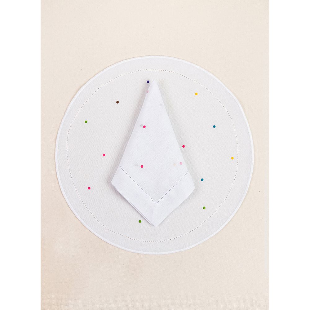 | Descrição do Produto | O Kit Confete é composto por: 1 jogo americano redondo com bordado ajour e confetes multicoloridos; 1 guardanapo em misto de linho suave, proporcionando conforto ao toque e alta absorção. Jogo Americano: Material: 50% Algodão e 50% Linho Medidas: 43cm Guardanapo: Material: 50% Algodão e 50% Linho Medidas: 44x44cm |