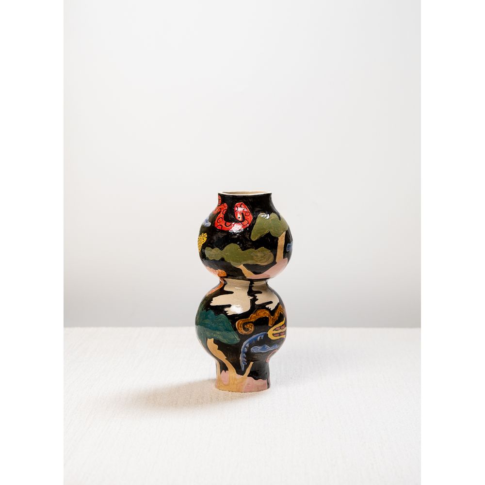 | Descrição do Produto | Vaso decorativo em cerâmica de alta temperatura, com estrutura composta por dois volumes esféricos sobrepostos. Pintura manual em tons escuros, com ilustrações de pássaros e formas orgânicas. Dimensões aproximadas: 25 cm de altura x 18 cm de largura. Peça artesanal, sujeita a variações naturais de forma e pintura. |